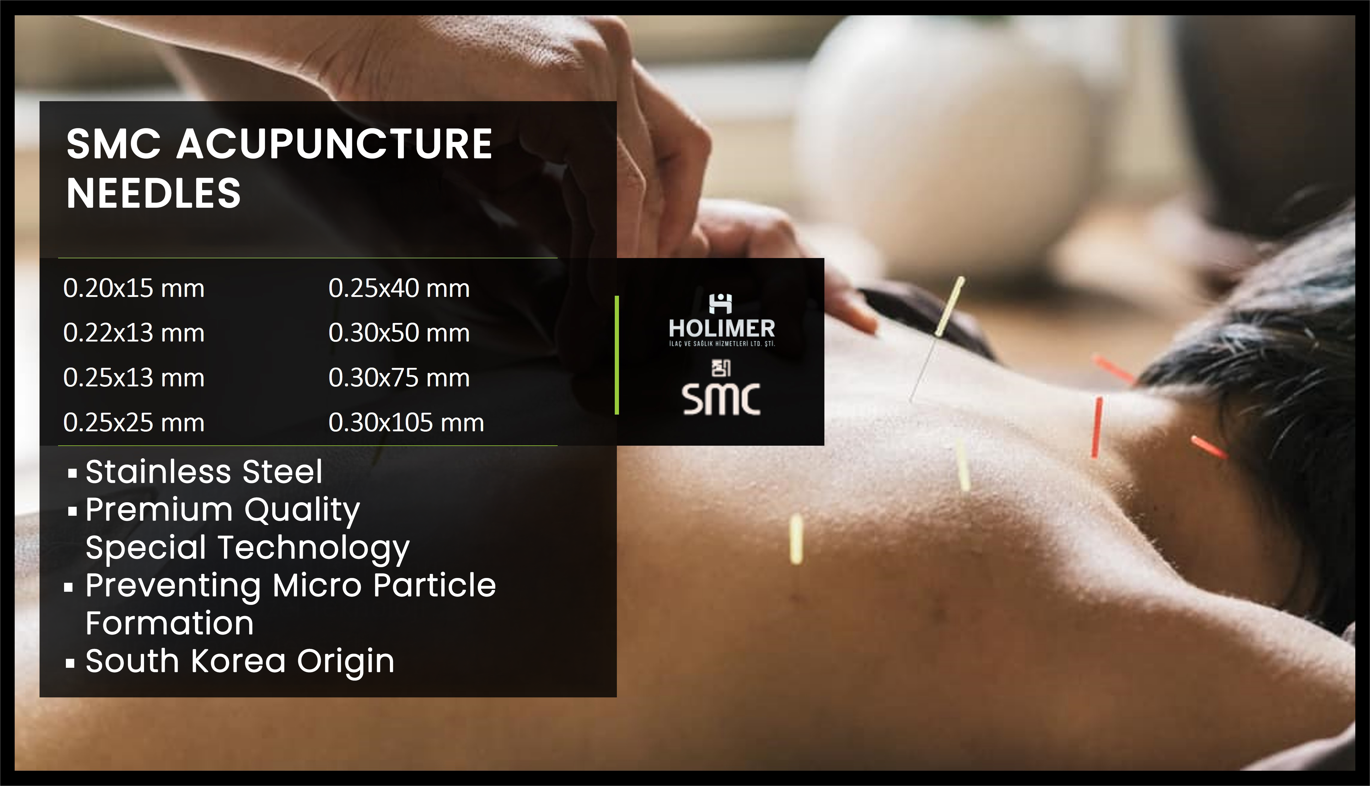 SMC (SMART MEDICAL CURE) ACUPUNCTURE NEEDLESMC (Smart Medical Cure) is a brand of premium quality acupuncture needles manufactured in South Korea. It is a needle that doctors use safely and happily with its special steel and special technology. As Holimer Pharmaceuticals and Health, we are the only official distributor of SMC both in Europe and Turkey.