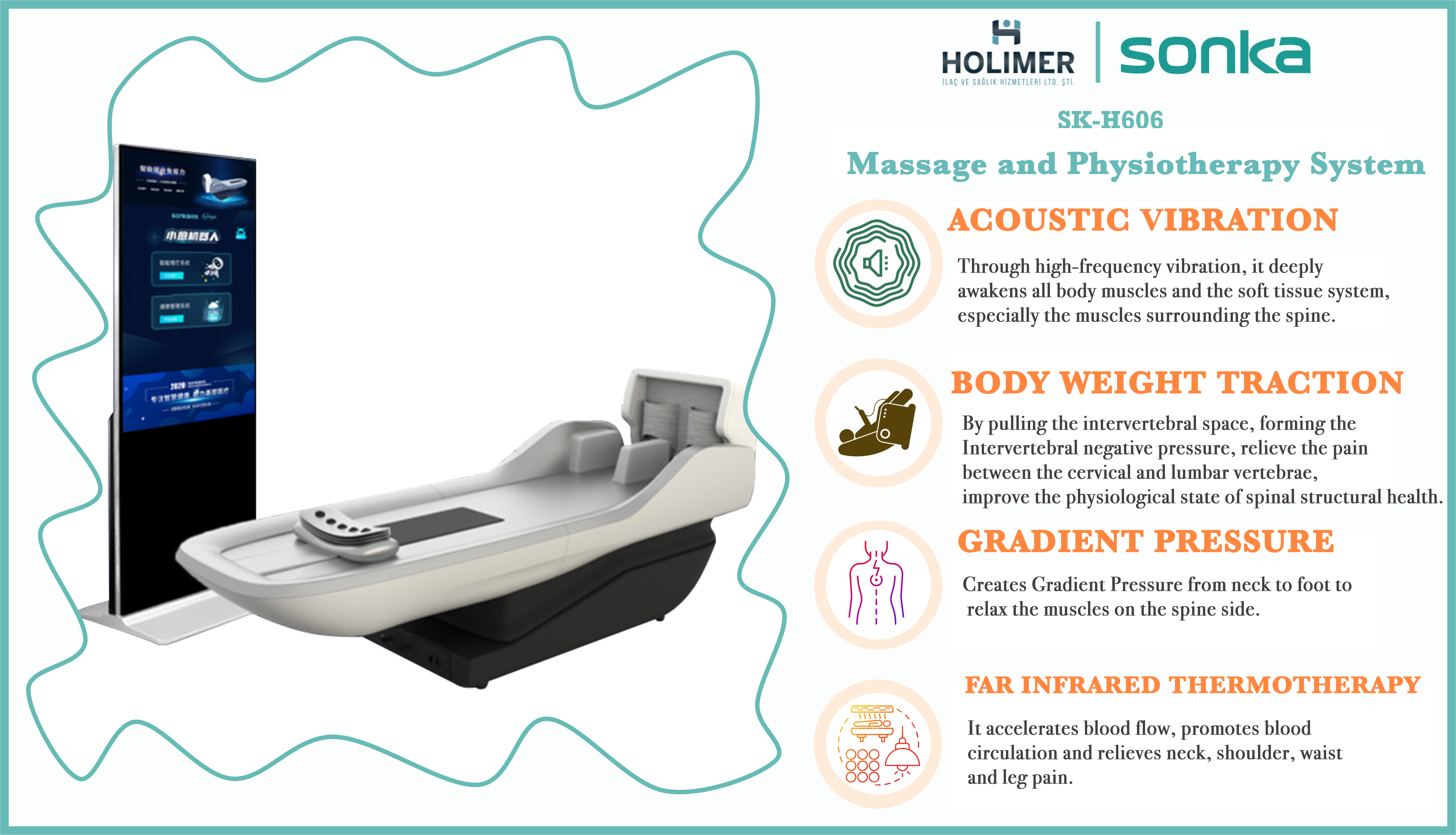 Sonka SK-H606 massage device is an artificial intelligence-based, professional physiotherapy device that supports the immune system. With the integration of advanced technology and Chinese classical medicine, significant results can be achieved in the treatment of pain, limitation of movement and other problems in the body.